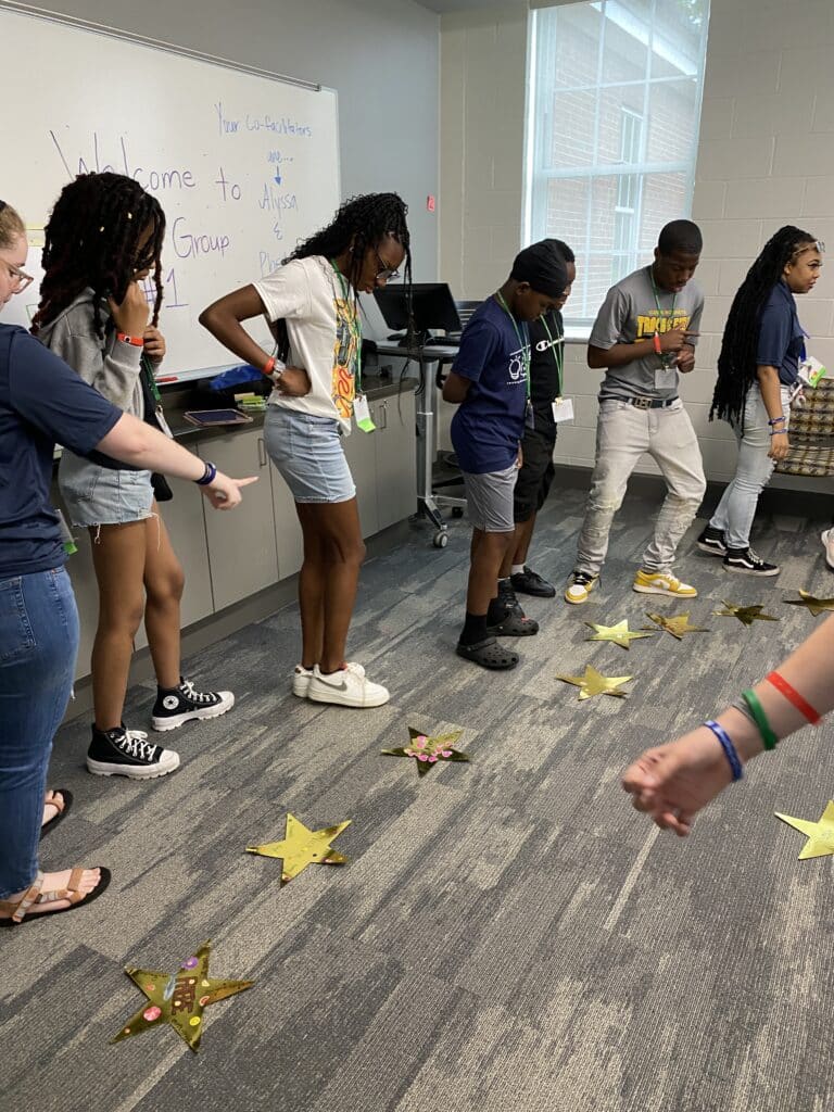 Once everyone has completed their stars, instruct the group to stand and create a “Walk of Fame” by placing the stars in a line on the floor. The line does not have to be perfectly straight. It can wind around the room to give more space for walking it. When the stars are placed, invite the group to walk around and look at each star. After a few minutes, ask the group to stand by their own star. Lead the debrief with the group standing.